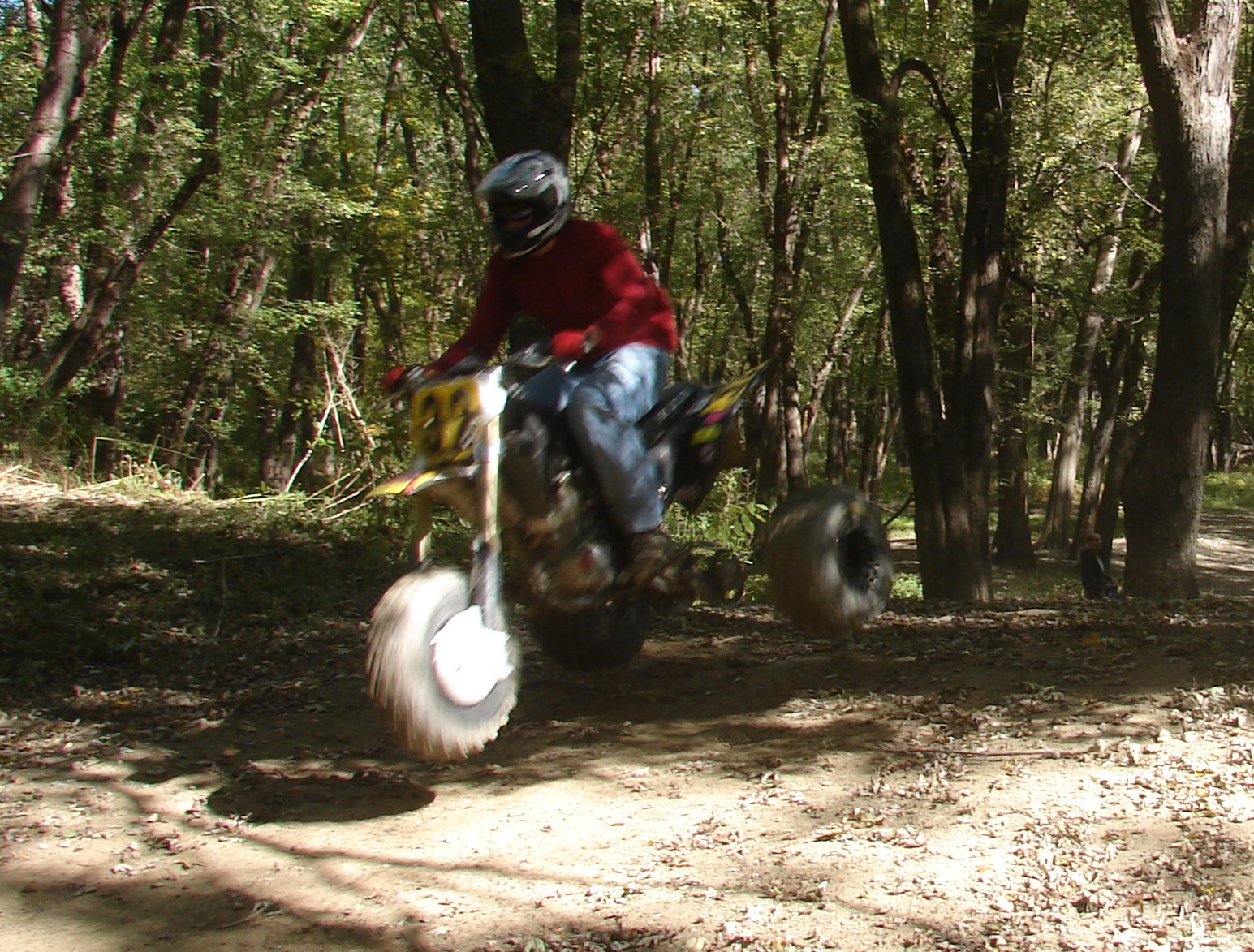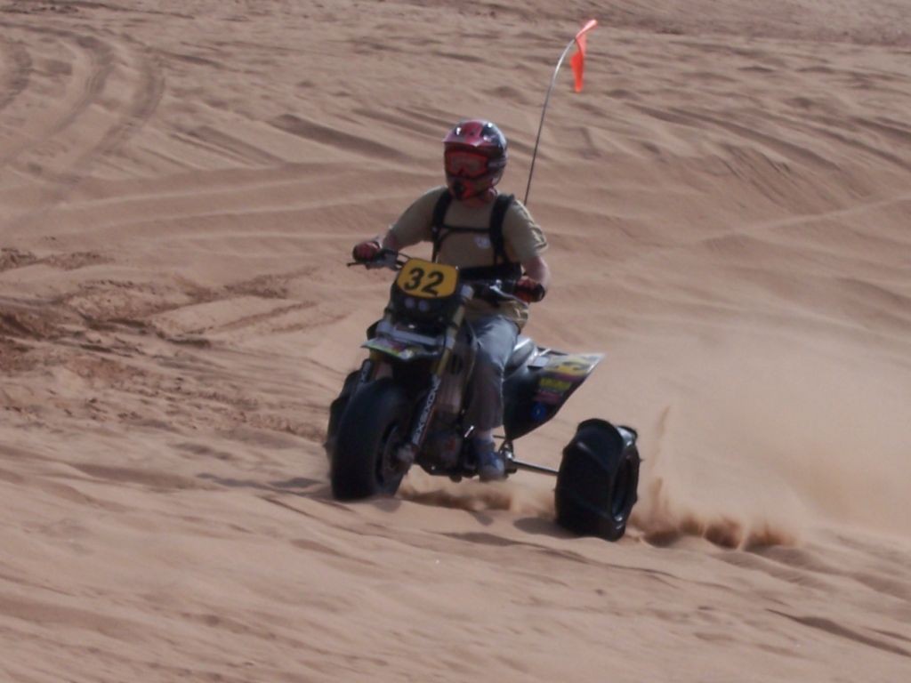So I did some slow and high speed turns and power launches to see how it handled more than just open throttle rippin ass. I don't think I ever got into 5th gear. The first thing I told Bill was: it’s hard to whip the back end around. It wasn't the machine. It was the knobby (front tire) he was running when I rode it with the addition of the comp cut sand skates. I suggested changing it out to the mohawk and he promptly did. Keep in mind now, I haven't ridden a trike in 2 years or so, and I was used to having 2 front sand tires. The difficulty to whip the ass end around was not the machine's fault in anyway. It was a combination of knobby front and the rear hooking up really good.